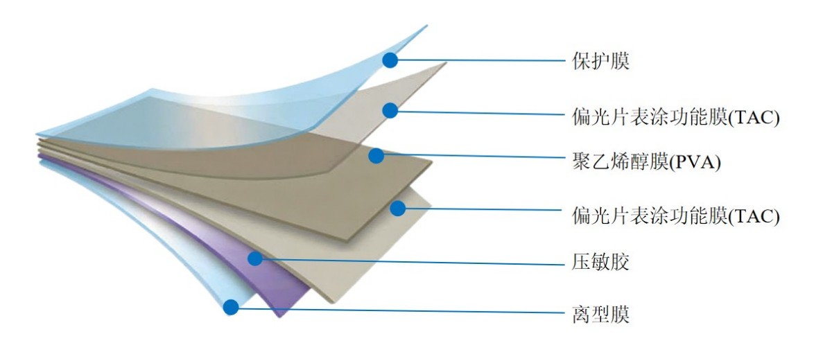 偏光片是光电显示器的核心组件,通常由聚乙烯醇(PVA)膜、两侧光学功能薄膜,以及粘接层(压敏胶,PSA)和表面保护层构成。偏光片的基本结构如图所示: