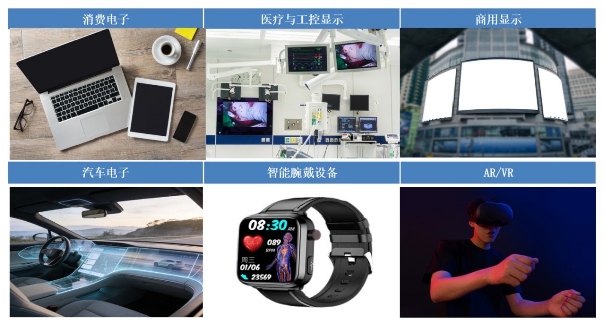 偏光片广泛应用于消费电子(手机、笔记本电脑、平板电脑、电视等)、汽车电子(车载显示、HUD抬头显示等)、商用显示(广告屏、拼接墙等)、医疗与工控显示(工控屏、医疗影像等)、可穿戴(手表、手环等)及VR/AR等显示终端。具体应用场景如下: